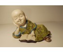 P1035821 Poly. Liggende baby monk met boek groen. L x H : 17 x 10 cm.