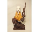 Poly. Monnik met gekleurde jas mediterend in boom. Hoogte 35 cm.