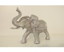 Poly. Zilveren olifant met dekkleden, slurf omhoog. LxH : 28x21 cm.