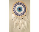 Dreamcatcher. Blauw wit gehaakte dreamcatcher klassiek model met witte veren en houten kralen. Doorsnede 25 cm., lengte 70 cm.