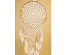 8530101 Dreamcatcher. Gehaakte XL dreamcatcher met rieten rand, witte veren en houten kralen. Diameter 53 cm., lengte 140 cm.