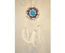 8530129 Dreamcatcher. Mini dreamcatcher 6 cm. diameter donkerblauw (oog van God) lengte +/- 25 cm. met witte veren en rand van touw. Per 12 stuks verpakt. Prijs is per 12 stuks.