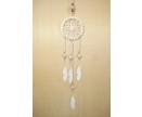 Metal hanging decoration. White metal dreamcatcher with feathers and wooden marbles. Length : 72 cm. Per 6 stuks verpakt. Prijs is per 6 stuks.