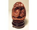 H2010023 Hout. Handgesneden wortelhouten ei met snijwerk van dieren (assorti) inclusief houten eiervoetje. Hoogte +/- 7,5 cm., diameter +/- 5 cm.