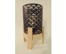 L21728A Led lamp. Led lamp met cilindrisch zwart metalen kap met bloemmotief op ronde houten basis (diameter 13 cm.) met 4 houten pootjes. Hoogte 25 cm. Op 3 AAA batterijen (niet meegeleverd).