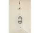 M191913 Metal hanging decoration. Klein porseleinen vogeltje met hartjes en blaadjes en klein kooitje voor theelicht. Donkergrijs. Lengte : 86 cm. Per 4 stuks verpakt. Prijs is per 4 stuks.