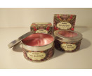 Geurkaars Goloka The Buddha in versierd blikje (diameter 8 cm./ hoogte 4 cm.) met venstertje. Verpakt in mooi kartonnen doosje 8,5x8,5x4,5 cm.
