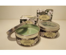 Geurkaars Goloka Jasmine in versierd blikje (diameter 8 cm./ hoogte 4 cm.) met venstertje. Verpakt in mooi kartonnen doosje 8,5x8,5x4,5 cm.