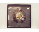 T40823 Wanddecoratie. Bruine veren met rieten middelpunt met schelpen achter glas in zwarte lijst. 90 x 90 cm.