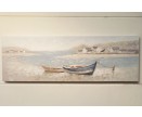 Oilpainting. Bootjes in baai bij kustdorpje 50 x 150 cm.
