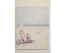 Olieverfschilderij. Surfplanken bij bewegwijzeringspaal met reddingsboei. Mensen in zee op achtergrond. 60 x 80 cm.