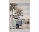 Olieverfschilderij. VW busje aan het strand met surfboards en palmbomen en bordje richting het strand. 90 x 120 cm.